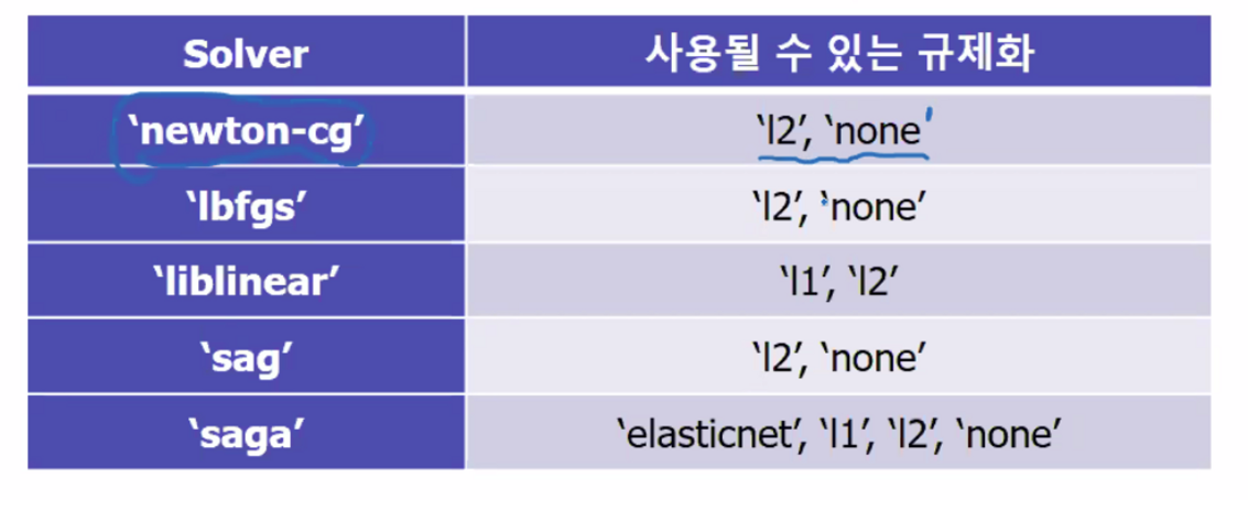 각 solver의 종류마다 사용 할 수 있는 규제화(regularization) 방식에는 차이가 있다.