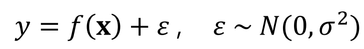 이러한 가정에서 노이즈는 평균이 0이고 분산이 $\sigma^2$인 i.i.d(independent and identically distributed)로부터 샘플링 되었다고 가정한다. 위의 식에서 $f(x)$는 우리가 찾고자 하는 true function이며, 우리의 모델 $\hat{f(x)}$는 true function $f(x)$를 모사하도록 하는 것이 목표이다.