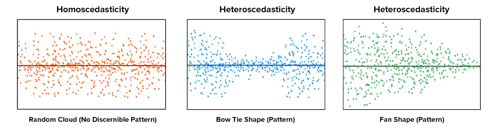 잔차(Residual)의 분산이 일정한 상수여야 한다. 아래의 그림과 같이 잔차의 분포가 특정한 패턴을 보이면 안된다.
