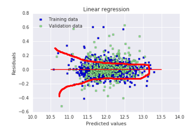 보이는 그래프는 Predicted value $\hat{y}$의 값에 상관없이 Residual이 고르게 퍼져있는 모습으로, 등분산의 형태를 띄고 있음을 알 수 있으며, 이는 2번째 성질은 "잔차의 등분산성"에 해당한다.